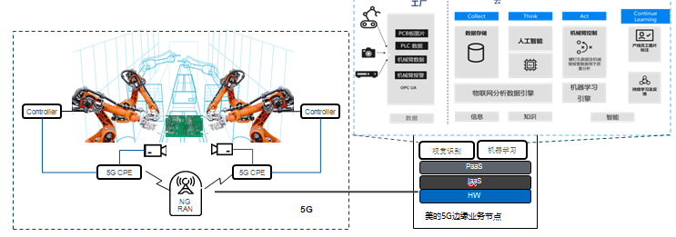 (2)機(jī)器視覺缺陷檢測(cè):通過部署超高清攝像頭采集PCB電路板的圖像,并結(jié)合5G網(wǎng)絡(luò)大帶寬、低延時(shí)特性,將數(shù)據(jù)傳輸至部署在邊緣云上的圖像分析系統(tǒng),自動(dòng)判斷PCB是否存在缺陷,并反饋分析結(jié)果, 未來,還將部署分揀機(jī)器人可根據(jù)圖像識(shí)別系統(tǒng)結(jié)果挑出不良產(chǎn)品。