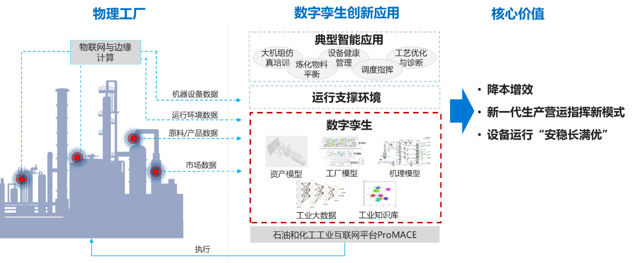 基于數(shù)字孿生的工業(yè)互聯(lián)網(wǎng)應用,融合了十多年石化行業(yè)經(jīng)驗與認知,將數(shù)字孿生技術(shù)沉淀于工業(yè)互聯(lián)網(wǎng)平臺,通過構(gòu)建以資產(chǎn)模型、工廠模型、機理模型、工業(yè)大數(shù)據(jù)模型、工業(yè)專家知識庫為核心的數(shù)字孿生體,支撐典型智能應用,為石油和化工行業(yè)的數(shù)字化轉(zhuǎn)型發(fā)展提供新動能。