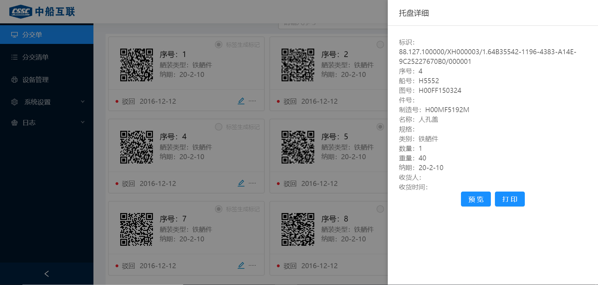 非標(biāo)件成品賦碼模塊結(jié)合工業(yè)互聯(lián)網(wǎng)標(biāo)識解析二級節(jié)點(diǎn),獲取在制非標(biāo)件編碼、屬性、圖紙等信息,并且通過與打印機(jī)、掃描設(shè)備等賦碼和標(biāo)識識別設(shè)備集成,實(shí)現(xiàn)標(biāo)識的快速打印,同時(shí)通過打印信息與生產(chǎn)制造信息的集成,實(shí)現(xiàn)配套企業(yè)生產(chǎn)制造狀態(tài)的實(shí)時(shí)在線反饋。其系統(tǒng)界面如下圖所示:
