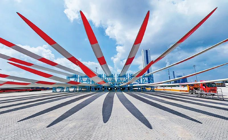 綠色低碳是新型工業(yè)化的生態(tài)底色。近年來,我國穩(wěn)妥有序推進(jìn)工業(yè)綠色低碳轉(zhuǎn)型,積極打造綠色產(chǎn)業(yè)集群,努力讓綠色成為高質(zhì)量發(fā)展的鮮明底色。圖為2023年9月8日,一批風(fēng)電葉片在江蘇省鹽城港射陽港區(qū)碼頭等待運(yùn)輸。 新華社記者 李博/攝