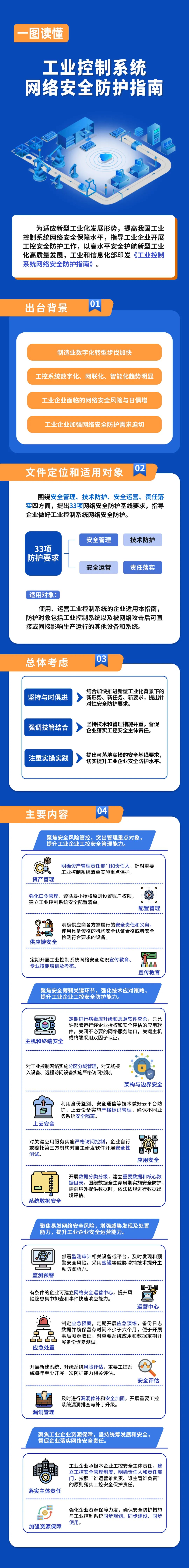 《防護(hù)指南》定位于面向工業(yè)企業(yè)做好網(wǎng)絡(luò)安全防護(hù)的指導(dǎo)性文件,堅(jiān)持統(tǒng)籌發(fā)展和安全,圍繞安全管理、技術(shù)防護(hù)、安全運(yùn)營、責(zé)任落實(shí)四方面,提出三十三項(xiàng)指導(dǎo)性安全防護(hù)基線要求,推動解決走好新型工業(yè)化道路過程中工業(yè)控制系統(tǒng)網(wǎng)絡(luò)安全面臨的突出問題。