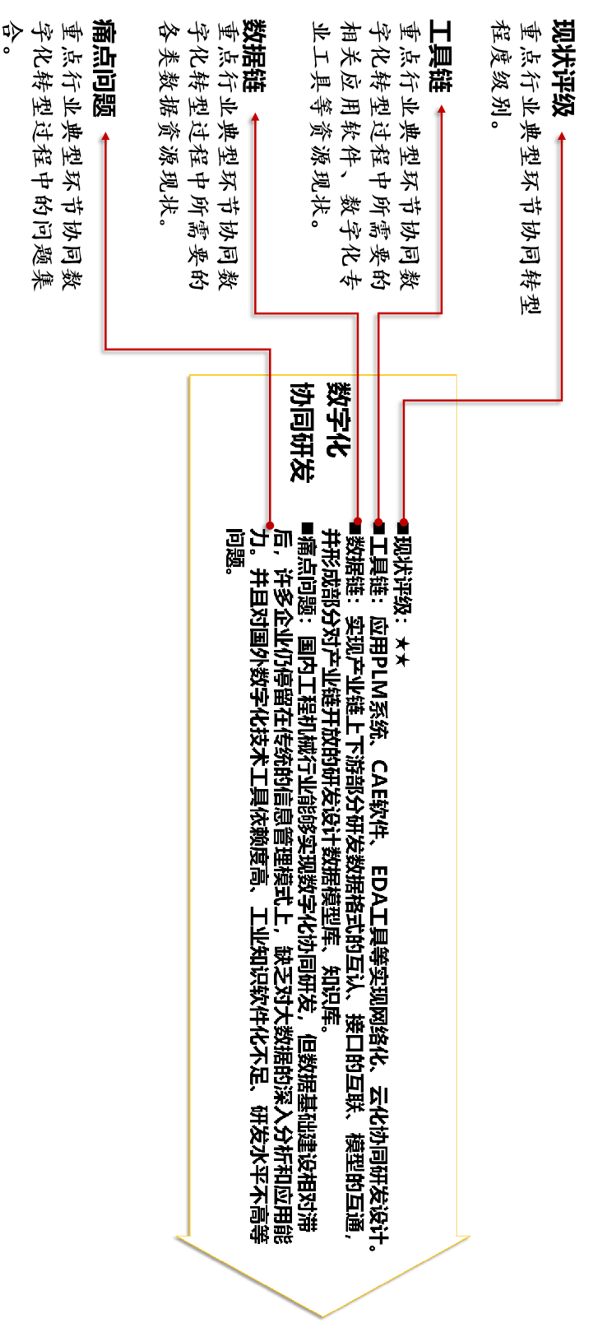 在行業(yè)場(chǎng)景圖譜中,每個(gè)場(chǎng)景由場(chǎng)景編號(hào)、場(chǎng)景名稱(chēng)、場(chǎng)景現(xiàn)狀評(píng)級(jí)、場(chǎng)景轉(zhuǎn)型價(jià)值標(biāo)簽、各類(lèi)數(shù)字化要素及場(chǎng)景痛點(diǎn)等內(nèi)容組成,以標(biāo)準(zhǔn)化的方式對(duì)所有場(chǎng)景進(jìn)行描述和表達(dá)。單一場(chǎng)景以工程機(jī)械行業(yè)“產(chǎn)品整體研發(fā)設(shè)計(jì)和仿真測(cè)試”場(chǎng)景為例(如圖2所示),跨業(yè)務(wù)協(xié)同場(chǎng)景以鋼鐵行業(yè)“數(shù)字化協(xié)同管理”場(chǎng)景為例(如圖3所示)。