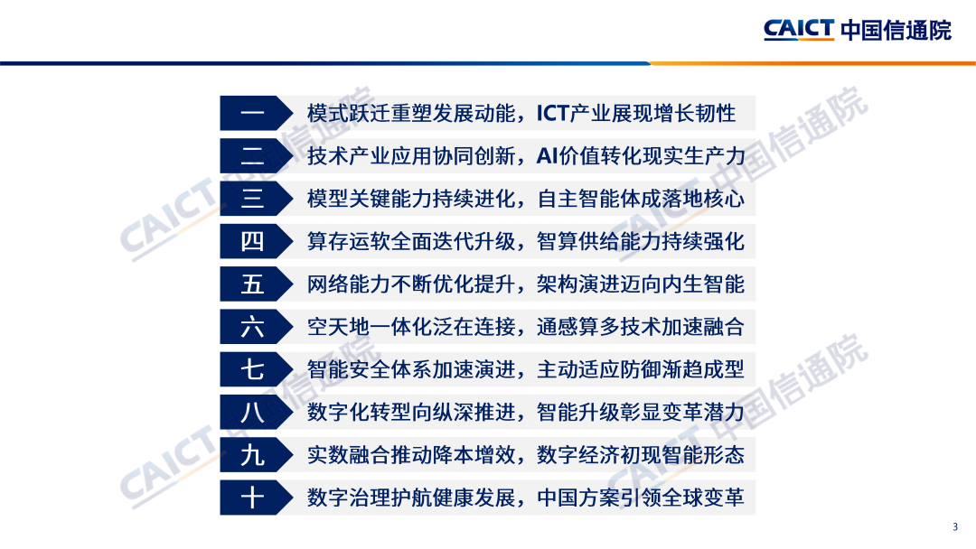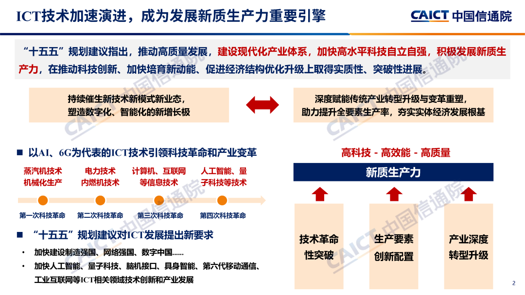 “十五五”規(guī)劃建議提出,推動(dòng)高質(zhì)量發(fā)展,建設(shè)現(xiàn)代化產(chǎn)業(yè)體系,加快高水平科技自立自強(qiáng),積極發(fā)展新質(zhì)生產(chǎn)力。以人工智能為代表的新一代信息通信技術(shù)正在引領(lǐng)新一輪科技革命和產(chǎn)業(yè)變革,日益成為培育發(fā)展新質(zhì)生產(chǎn)力、推進(jìn)中國式現(xiàn)代化、實(shí)現(xiàn)高質(zhì)量發(fā)展的關(guān)鍵支撐。中國信通院研判認(rèn)為,面向“十五五”,ICT產(chǎn)業(yè)正在進(jìn)入以智能化重構(gòu)為驅(qū)動(dòng)的新增長周期,人工智能技術(shù)產(chǎn)業(yè)應(yīng)用協(xié)同創(chuàng)新,將驅(qū)動(dòng)通信、感知和計(jì)算等信息基礎(chǔ)設(shè)施迭代升級(jí),推動(dòng)智能終端、智能服務(wù)等軟硬件協(xié)同創(chuàng)新,促進(jìn)智能安全體系變革重塑;數(shù)字化轉(zhuǎn)型向縱深推進(jìn),智能技術(shù)全面融入,推動(dòng)生產(chǎn)要素創(chuàng)新性配置,深度賦能傳統(tǒng)產(chǎn)業(yè)轉(zhuǎn)型升級(jí)和變革重塑,助力提升全要素生產(chǎn)率;國內(nèi)數(shù)字治理體系建設(shè)縱深推進(jìn),中國將以更加積極主動(dòng)姿態(tài)參與全球數(shù)字治理。