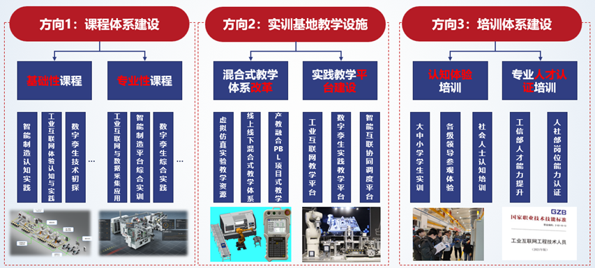 實訓(xùn)基地從產(chǎn)業(yè)人才培養(yǎng)需求出發(fā),深挖工業(yè)互聯(lián)網(wǎng)行業(yè)應(yīng)用型人才培養(yǎng)的新時期內(nèi)核,積極開展課程體系教育教學(xué)改革。目前主要面向三個方向開設(shè)相應(yīng)實訓(xùn)課程:工業(yè)互聯(lián)網(wǎng)方向,智能制造方向和數(shù)字孿生方向。其中,工業(yè)互聯(lián)網(wǎng)方向主要內(nèi)容包括工業(yè)互聯(lián)網(wǎng)基礎(chǔ)知識、產(chǎn)品模式及層級劃分、工業(yè)互聯(lián)網(wǎng)基礎(chǔ)技術(shù)及應(yīng)用技術(shù)和行業(yè)解決案例等;智能制造方向主要內(nèi)容包括工業(yè)4.0與智能制造發(fā)展趨勢、電氣原理、PLC控制、生產(chǎn)計劃控制、智能傳感互聯(lián)、工業(yè)機器人與自動化等;數(shù)字孿生方向主要內(nèi)容包括數(shù)字孿生起源、定義、技術(shù)體系、模型構(gòu)建與一體化設(shè)計、接口、通信、虛實連接、應(yīng)用實踐等。