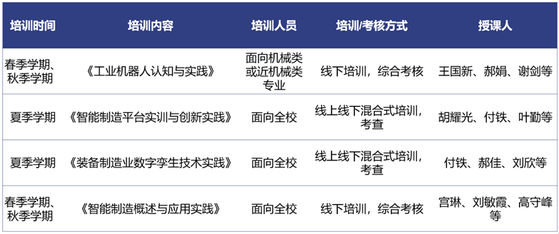 現(xiàn)有課程包括《工程訓(xùn)練》、《制造技術(shù)基礎(chǔ)訓(xùn)練》、《智能制造綜合實踐》、《工業(yè)機器人認(rèn)知與實踐》、《數(shù)字孿生技術(shù)實踐》、《智能制造平臺實訓(xùn)》以及《生產(chǎn)系統(tǒng)綜合設(shè)計與實驗》等,從多個方向面向工業(yè)互聯(lián)網(wǎng)相關(guān)人才提供實踐能力、職業(yè)素養(yǎng)、創(chuàng)新精神等方面的綜合培養(yǎng),為培養(yǎng)適應(yīng)工業(yè)互聯(lián)網(wǎng)發(fā)展需要的高素質(zhì)、全面發(fā)展的產(chǎn)業(yè)人才提供良好實訓(xùn)條件。考試考核方法目前主要采用考查方式,以實踐任務(wù)完成情況為打分依據(jù),對學(xué)員進(jìn)行考核。