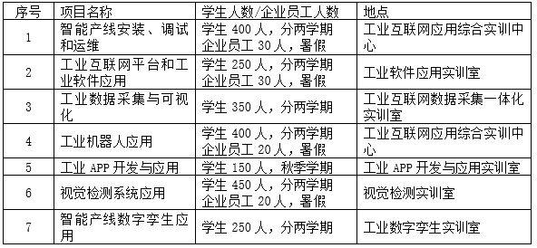 “工業(yè)互聯(lián)網(wǎng)產(chǎn)業(yè)聯(lián)盟 杭州科技職業(yè)技術(shù)學(xué)院工業(yè)互聯(lián)網(wǎng)應(yīng)用實(shí)訓(xùn)基地”建有:智能系統(tǒng)集成技術(shù)實(shí)訓(xùn)中心、工業(yè)互聯(lián)網(wǎng)應(yīng)用綜合實(shí)訓(xùn)中心、工業(yè)控制系統(tǒng)實(shí)訓(xùn)室、工業(yè)互聯(lián)網(wǎng)數(shù)據(jù)采集一體化實(shí)訓(xùn)室、工業(yè)APP開發(fā)與應(yīng)用實(shí)訓(xùn)室、工業(yè)軟件應(yīng)用實(shí)訓(xùn)室、工業(yè)數(shù)字孿生實(shí)訓(xùn)室、視覺檢測實(shí)訓(xùn)室、工業(yè)機(jī)器人應(yīng)用實(shí)訓(xùn)室等專業(yè)實(shí)訓(xùn)室,服務(wù)工業(yè)互聯(lián)網(wǎng)應(yīng)用、電氣自動化技術(shù)、物聯(lián)網(wǎng)應(yīng)用技術(shù)、人工智能技術(shù)應(yīng)用、應(yīng)用電子技術(shù)等專業(yè)的20余門課程。實(shí)訓(xùn)基地開設(shè)的綜合實(shí)訓(xùn)項(xiàng)目有:智能產(chǎn)線安裝、調(diào)試和運(yùn)維、工業(yè)互聯(lián)網(wǎng)平臺和工業(yè)軟件應(yīng)用、工業(yè)數(shù)據(jù)采集與可視化、工業(yè)機(jī)器人應(yīng)用、工業(yè)APP開發(fā)與應(yīng)用、視覺檢測系統(tǒng)應(yīng)用、智能產(chǎn)線數(shù)字孿生應(yīng)用等。具體開設(shè)計(jì)劃如表1所示: