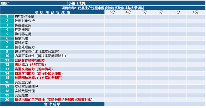 為了使實(shí)訓(xùn)項(xiàng)目達(dá)到預(yù)期培養(yǎng)目標(biāo),實(shí)訓(xùn)基地提出了“軟硬能力”并舉的考核評價(jià)方式。將硬能力分解為實(shí)訓(xùn)項(xiàng)目各技能點(diǎn),軟能力分解為表達(dá)溝通等綜合素養(yǎng)點(diǎn)。以“藥品生產(chǎn)過程中溫度控制系統(tǒng)集成與安裝調(diào)試”項(xiàng)目為例,具體的考核評價(jià)體系如圖6所示: