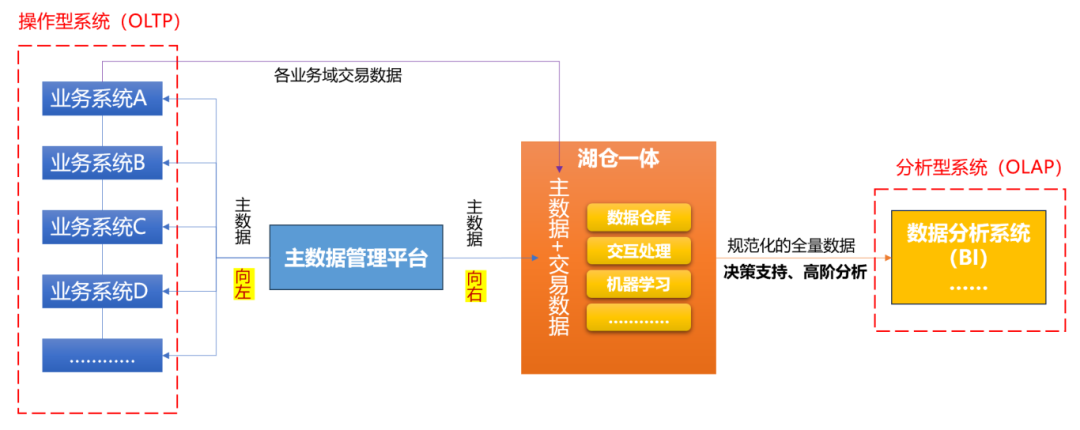 目前主數(shù)據(jù)管理平臺承擔著一種比較特殊的角色,介于數(shù)據(jù)交易側(cè)和數(shù)據(jù)分析側(cè)之間,兼具源頭業(yè)務IT系統(tǒng)和數(shù)據(jù)倉庫等平臺的特點。當主數(shù)據(jù)管理系統(tǒng)作為數(shù)據(jù)記錄的產(chǎn)生源頭,承擔著共性業(yè)務流程執(zhí)行的功能;當主數(shù)據(jù)管理系統(tǒng)作為主數(shù)據(jù)記錄分發(fā)交換的源頭時,又承擔著數(shù)據(jù)架構(gòu)管控的職責。隨著企業(yè)核心系統(tǒng)統(tǒng)建、能力大集中、數(shù)據(jù)統(tǒng)一入湖和全局治理體系建設工作的深入開展,未來主數(shù)據(jù)管理平臺的職責可以向左和向右遷移。