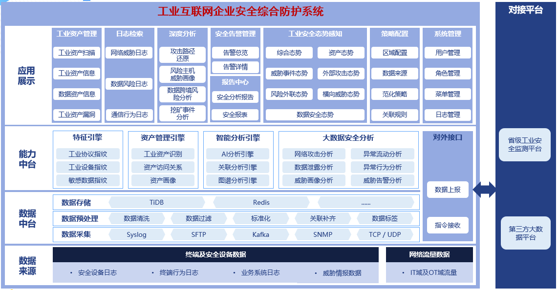 同時,平臺與省級工業(yè)互聯(lián)網(wǎng)平臺對接,滿足分類分級合規(guī)要求及數(shù)據(jù)共享,形成工業(yè)互聯(lián)網(wǎng)網(wǎng)絡(luò)安全的完整閉環(huán)。