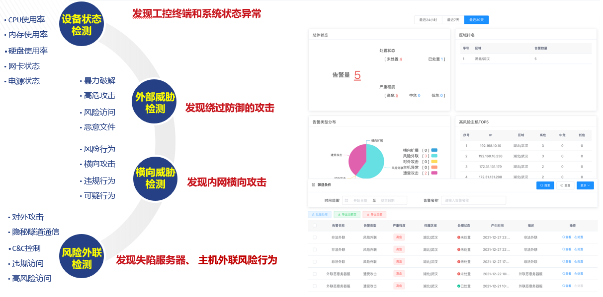 支持安全合規(guī)檢測、異常攻擊檢測、非法外聯(lián)檢測、設(shè)備運行狀態(tài)檢測、內(nèi)網(wǎng)異常訪問檢測、非法程序啟動檢測、APT攻擊檢測、惡意加密流量檢測等。