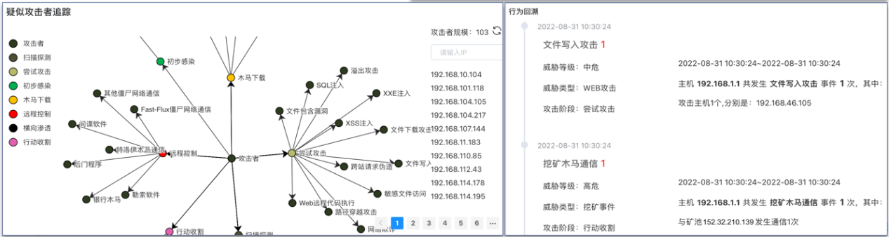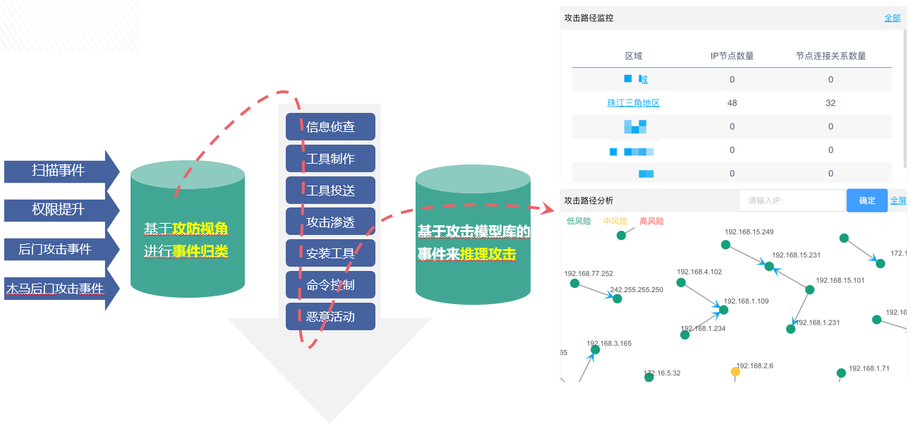 基于ATT&CK安全分析模型,對威脅事件和攻擊行為進行攻擊鏈溯源和取證,如下圖所示,通過對各類威脅事件基于攻防視角等多維度歸類,依托安全分析模型和各攻擊階段的攻擊路徑和手法進行關(guān)聯(lián)分析,為用戶還原完整的攻擊過程和攻擊影響范圍,并針對攻擊者和被攻擊者進行行為回溯和畫像。