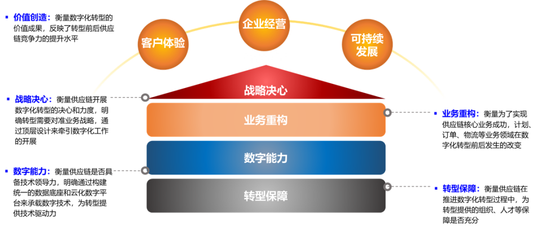 華為供應(yīng)鏈數(shù)字化轉(zhuǎn)型評估模型分為5個維度,包括價值目標(biāo)、戰(zhàn)略決心、業(yè)務(wù)重構(gòu)、數(shù)字能力和轉(zhuǎn)型支撐,共包含196個評估項(xiàng)。