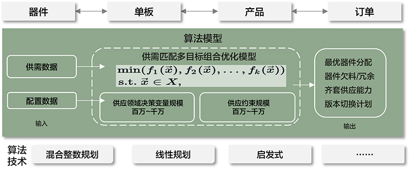 比如,在資源準備的場景中,華為供應鏈面臨著千萬級數據規模,億級計算規模的復雜業務場景。但是華為基于線性規劃、混合整數規劃、啟發式算法等求解方法的組合,構建了從器件、單板到產品、訂單之間的雙向模擬引擎(如圖3)。在錯綜復雜的產品結構樹和供應網絡節點中,快速找到資源準備的最優解,在供應能力最大化的同時實現存貨可控。
