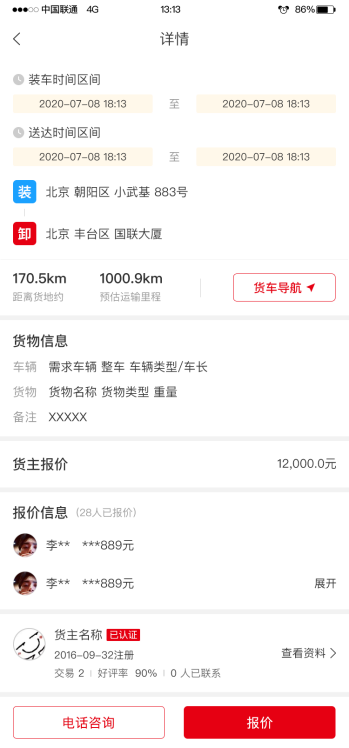 (2)國聯智運貨主端APP。本系統給所有運輸貨物的貨主提供一套運輸管理系統。此系統將提供更全面的線上運輸管理工具,提高管理效率、節約管理成本。利用北斗定位、LBS定位、物聯網、AI、大數據等科技手段,協同大宗物流運輸,為產業鏈企業智能匹配最佳線路和提供多式聯運運輸方案。貨主可在平臺進行發布貨源;包括訂單運單全流程管理。