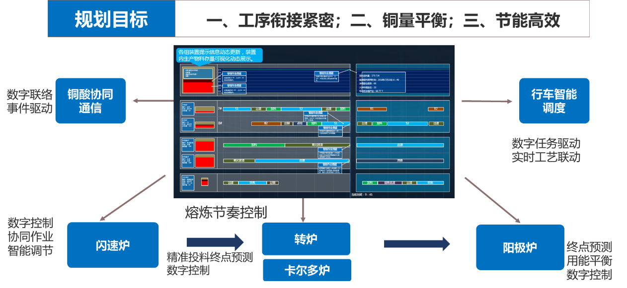 打造中國首家銅冶煉智能工廠,包括生產(chǎn)管理、供應鏈管理、設備管理、能源管理、安環(huán)管理、輔助決策。