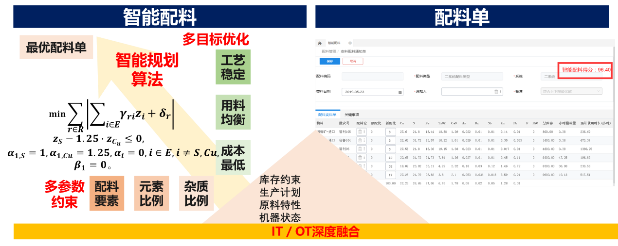 智能配料系統(tǒng)記錄配料相關的各種約束(約束條件在使用過程中進行迭代優(yōu)化),動態(tài)調用最新原料的存量和元素含量,由智能算法進行原料的投入配比規(guī)劃輸出。