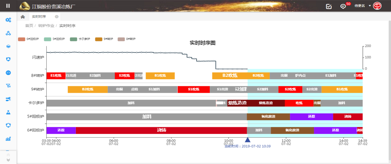 根據(jù)熔煉作業(yè)數(shù)據(jù)自動按熔爐組實時狀態(tài)形成節(jié)奏時序圖,提升整個熔煉系統(tǒng)調度指揮管理的智能化水平,以信息共享、過程可控、科學預判為重心,構建閃速爐、轉爐、陽極爐的生產(chǎn)管控的智能化支撐,共享三大爐完整的作業(yè)進度,及時、準確調整作業(yè)要求,實現(xiàn)作業(yè)預期判斷和產(chǎn)品質量最優(yōu)控制。