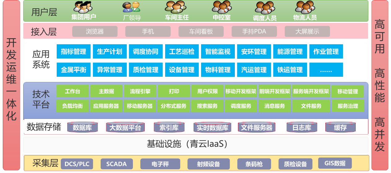 應用層:主要包括指標管理、生產(chǎn)計劃、調度協(xié)同、工藝巡檢、智能監(jiān)視、安環(huán)管理、能源管理、作業(yè)管理、金屬平衡、異常管理、質檢管理、設備管理、物料管理、汽運管理、鐵運管理等。