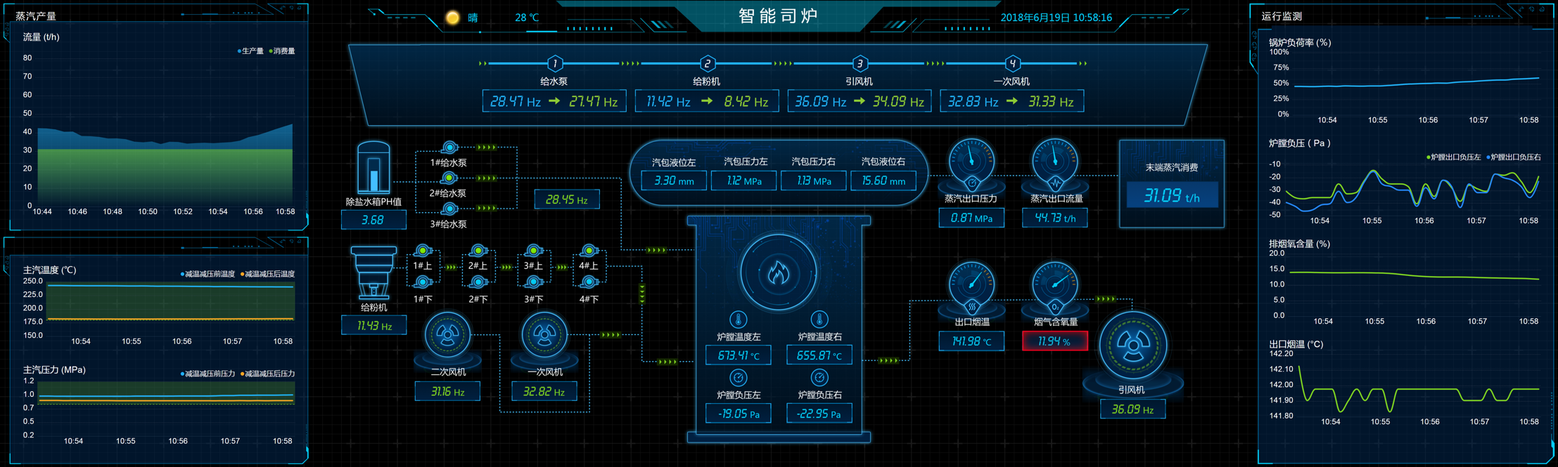 生產系統監控應該能夠提供對整個生產工藝過程的實時在線查看;能夠以組態圖的形式對化水的超濾、反滲透、混床,燃燒的水系統、鍋爐系統,環保的除塵、脫硫、脫銷等工藝過程展示重要參數的實時指標,同時能夠以曲線的形式展示各項生產數據的實時趨勢和歷史變化過程。如下圖所示:
