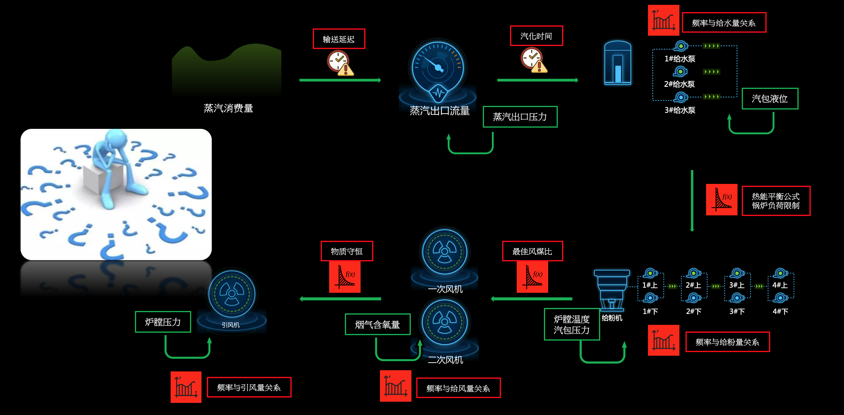 整個鍋爐控制過程是一個“非線性、強耦合、大延遲”的系統,這種問題對于人的理解和優化操作是無法實現的,即使是使用基于機理的計算模型也很難計算的很清楚,如下圖展示了鍋爐控制的分解環節機器困難點: