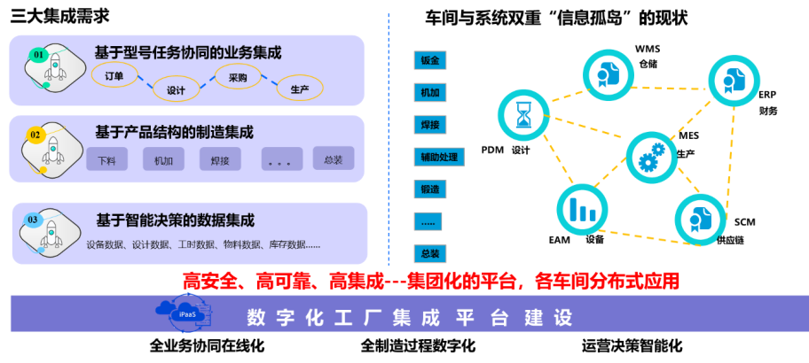 因?yàn)楹教煅b備制造行業(yè)的特殊性,同時(shí)還具有高安全、高可靠、高集成的要求;但是,現(xiàn)狀卻面臨著車間與系統(tǒng)的“雙重信息孤島”;集成平臺(tái)建設(shè)需求與“雙重信息孤島”是系統(tǒng)建設(shè)要解決的根本問(wèn)題。