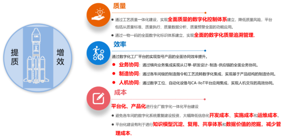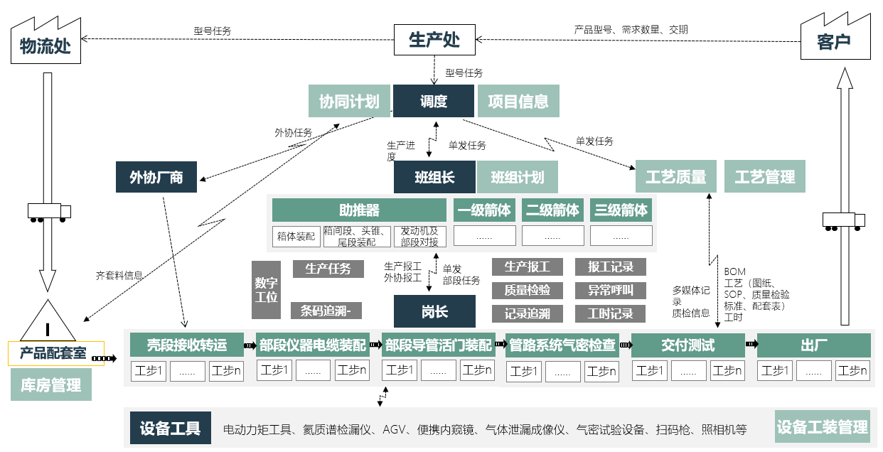 以數(shù)字化工廠平臺(tái)為基礎(chǔ),以總裝為起點(diǎn),向機(jī)加、輔助處理、部裝等制程輻射,實(shí)現(xiàn)航天裝備制造全業(yè)務(wù)流程、全價(jià)值鏈的數(shù)字化協(xié)同。