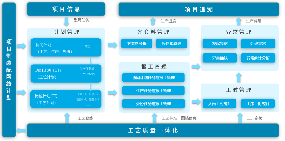 以單發(fā)產(chǎn)品的生產(chǎn)作為項(xiàng)目,通過(guò)單發(fā)總裝過(guò)程模型為網(wǎng)絡(luò)計(jì)劃控制主線,并貫穿于項(xiàng)目管理的整個(gè)過(guò)程;基于物料一物一碼的標(biāo)識(shí)編碼原則,從項(xiàng)目的立項(xiàng)開(kāi)始到項(xiàng)目結(jié)束的全過(guò)程,其工藝文件發(fā)布、物料齊配套、設(shè)備工裝配套、生產(chǎn)進(jìn)程等方面實(shí)現(xiàn)項(xiàng)目的全方位管理,使單發(fā)產(chǎn)品在總裝過(guò)程中信息化、透明化,可視化,從而實(shí)現(xiàn)總裝生產(chǎn)的脈動(dòng)式和單元式的靈活切換,達(dá)到進(jìn)度可控、風(fēng)險(xiǎn)提前預(yù)警的管理要求,真正做到存在即可追溯。