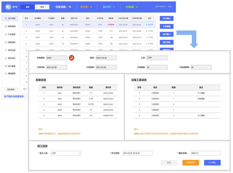 集成工藝管理平臺(tái)和制造運(yùn)營(yíng)管理系統(tǒng)信息,通過(guò)在各生產(chǎn)單元一體機(jī)終端建立數(shù)字工位(HMI),作為生產(chǎn)管控平臺(tái)在現(xiàn)場(chǎng)的執(zhí)行抓手,包含生產(chǎn)準(zhǔn)備、生產(chǎn)報(bào)工、質(zhì)量檢驗(yàn)、異常處理等現(xiàn)場(chǎng)執(zhí)行操作業(yè)務(wù)模塊。