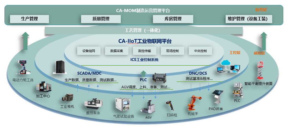 運(yùn)用物聯(lián)網(wǎng)、邊緣計(jì)算、工業(yè)控制等先進(jìn)互聯(lián)網(wǎng)技術(shù),建立CA-IIoT工業(yè)物聯(lián)網(wǎng)平臺(tái),實(shí)現(xiàn)設(shè)備組網(wǎng)、數(shù)據(jù)采集、數(shù)控傳輸、現(xiàn)場(chǎng)控制、中央控制功能;基于5G通訊技術(shù)實(shí)現(xiàn)生產(chǎn)線業(yè)務(wù)層人、機(jī)、料、法、環(huán)、測(cè)各要素的數(shù)據(jù)連接、數(shù)據(jù)感知、數(shù)據(jù)采集、數(shù)據(jù)傳輸、數(shù)據(jù)存儲(chǔ)以及控制指令的下發(fā)。