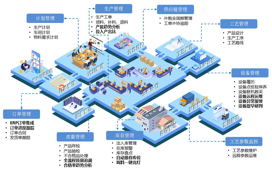 面向企業,提供一體化MES + 輕ERP生產數字化解決方案,實現以生產為核心的產供銷一體化數據連通和高效協同,幫助企業縮短訂單交付周期、提升產品品質、提升內部溝通效率等,進而降低企業管理成本,提高生產效率。