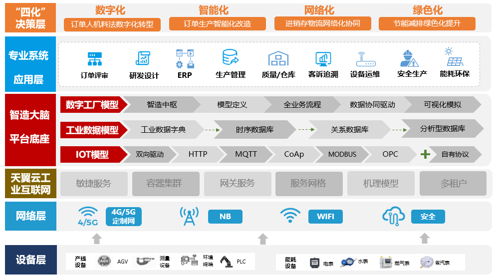 智造大腦平臺包含三個子系統(tǒng)工業(yè)制造模型、設(shè)備聯(lián)網(wǎng)模型、工業(yè)大數(shù)據(jù)模型,以5G網(wǎng)絡(luò)為底座打造全連接工廠,將研發(fā)、生產(chǎn)、倉儲、銷售等業(yè)務(wù)環(huán)節(jié)實(shí)現(xiàn)要素數(shù)字化,通過5G全流程數(shù)字化運(yùn)營智造平臺統(tǒng)一接入各業(yè)務(wù)系統(tǒng),數(shù)據(jù)匯集,可視化展示。