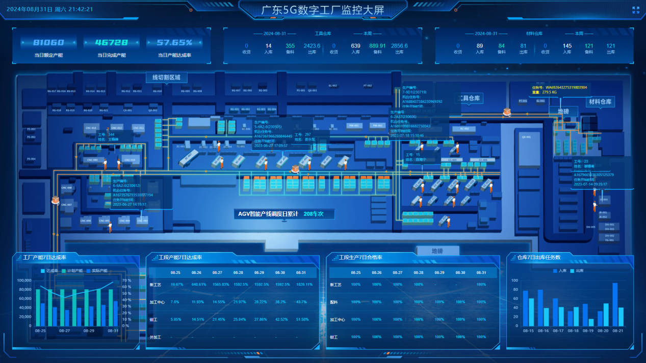 接收到生產(chǎn)訂單,根據(jù)設(shè)備5G聯(lián)機(jī)數(shù)據(jù)、訂單交期、各車間產(chǎn)能自動進(jìn)行排產(chǎn),生產(chǎn)現(xiàn)場結(jié)合智造大腦提供數(shù)據(jù)進(jìn)行智能派工協(xié)同生產(chǎn),智造大腦“滴滴派單”模式減少現(xiàn)場班組長90%+協(xié)同工作,提升了柔性制造效率、產(chǎn)能。