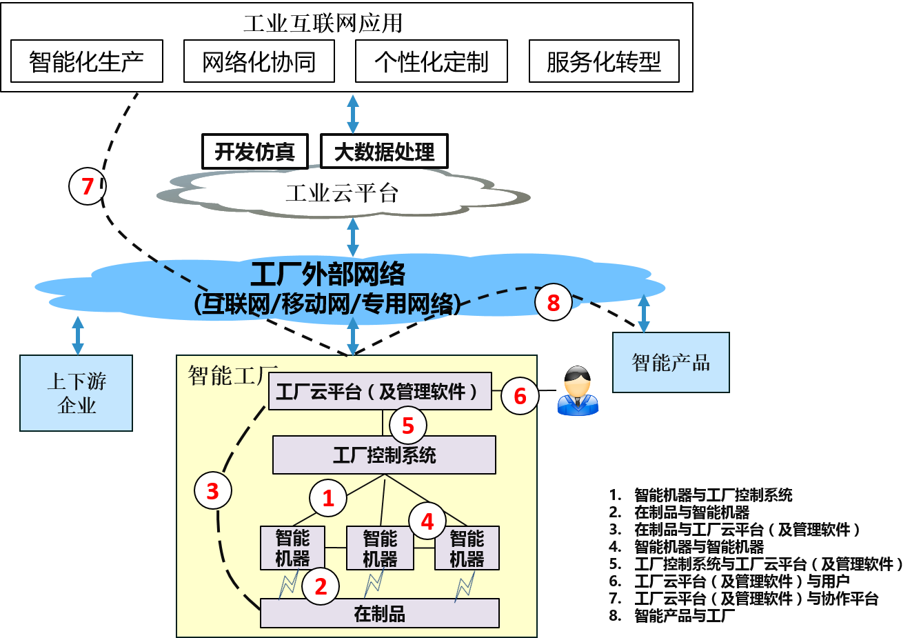 本方案涉及到從設備中采集數據及與云平臺算法模型交互,符合以下工廠控制系統與工廠云平臺交互范疇,對應工業互聯網網絡體系架構中的第五點。