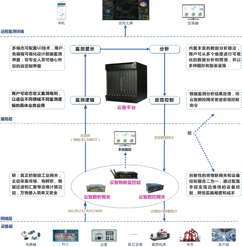 設(shè)備層:通過云智核心硬件產(chǎn)品—云智網(wǎng)關(guān),使得異構(gòu)多型工業(yè)設(shè)備任意接入,主流工業(yè)通訊協(xié)議動態(tài)適配,設(shè)備上網(wǎng)入云輕松安全。