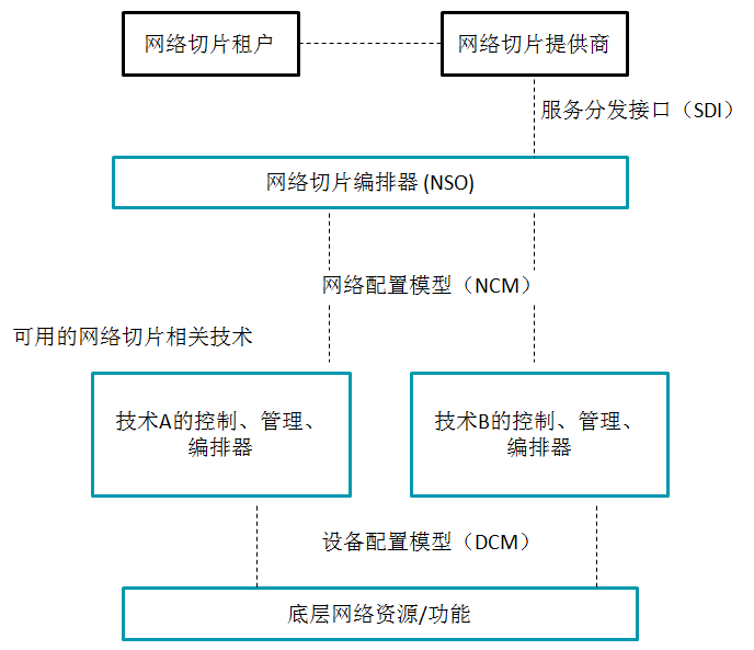 用戶NST通過服務模型來請求NSaaS,該服務模型用用戶的語言來描述切片,通常為業務體驗類的語言。切片提供者(運營商)將用戶需求翻譯給服務傳遞模型,這個模型可以用來描述運營商怎么使用自己的資源來提供支持業務。該傳遞業務模型會被發送到網絡切片的編排器(NSO),并且和不同的技術來映射,進一步分解到網絡配置模型中。最終在網絡配置模型(NCM)中建立起相對應的底層設施和功能的參數,從而調用相應的底層資源建立起相應切片的服務。