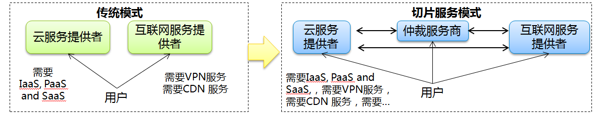 網絡切片可以實現計算資源與連接資源統籌調度和編排,滿足垂直行業需求的網絡與計算資源一站式服務。傳統模式下,用戶需要分別向云服務提供者和互聯網服務提供者請求IaaS、PaaS、SaaS服務以及VPN、CDN等網絡服務。網絡切片可以通過仲裁服務商提供給用戶集成式一體化的端到端的服務。
