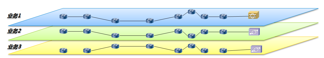 在傳統網絡“盡力而為”的傳輸方式下,多種業務流數據在網絡中混合傳輸,相互干擾,無法確切保證某種業務流的傳輸需求,如圖4。網絡切片可以將大網資源進行細粒度劃分和專用,為不同業務提供定制化的保證能力,如同不同業務都在各自的“專網”上傳輸,互不干擾,具有專用性、異構性和靈活性等特點,如圖5。