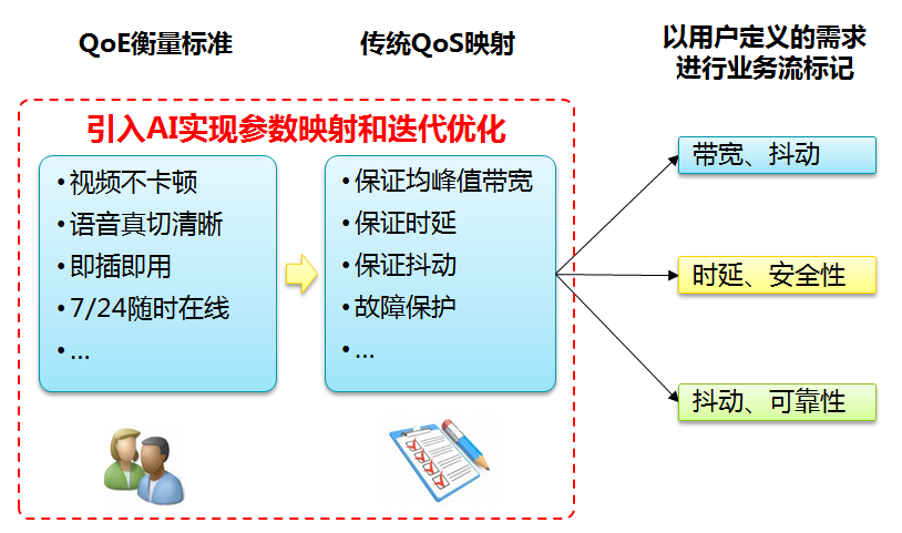 網絡切片實施的關鍵步驟是將用戶的實際需求映射為傳統網絡質量需求,例如將流暢清晰地播放視頻和語音,實現網絡設備的即插即用以及保障7天24小時隨時在線等需求,映射為網絡的平均峰值帶寬、時延、抖動以及故障保護等指標,從而使網絡切片提供商提供相應專用、隔離、服務可保證的網絡切片。并且,可以引入AI技術實現參數映射和迭代優化,更好的滿足用戶需求。
