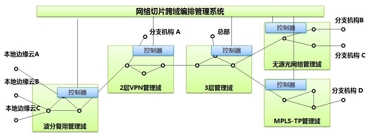 跨管理域編排實現端到端的網絡切片管理,滿足不同網絡拓撲、性能與功能的需求。網絡數據的傳輸過程中,不同的業務會由不同的方式或不同的網絡協議進行承載轉發。例如,分支機構向總部的業務請求,可能會經過2層VPN到3層路由等協議,分支機構向云發送業務請求,可能會經過無源光網絡到波分復用的轉換等。網絡切片需實現網絡各層級轉換的無縫銜接,保障業務數據流端到端的可識別性,從而提供專屬的網絡切片來進行承載和轉發。