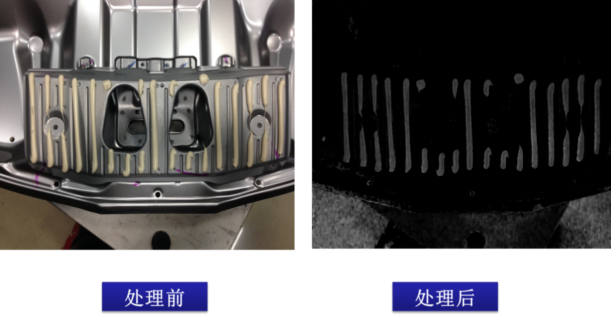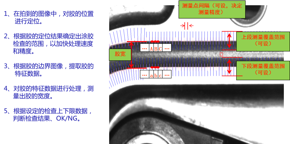 處理后圖片,系統(tǒng)會對圖片中膠線進(jìn)行定位分析,識別膠線位置,測定膠線的各項(xiàng)參數(shù),并與工藝指標(biāo)要求進(jìn)行判定,最終給此次涂膠作業(yè)的檢測結(jié)果給予判定,其檢測過程如下圖示例所示: