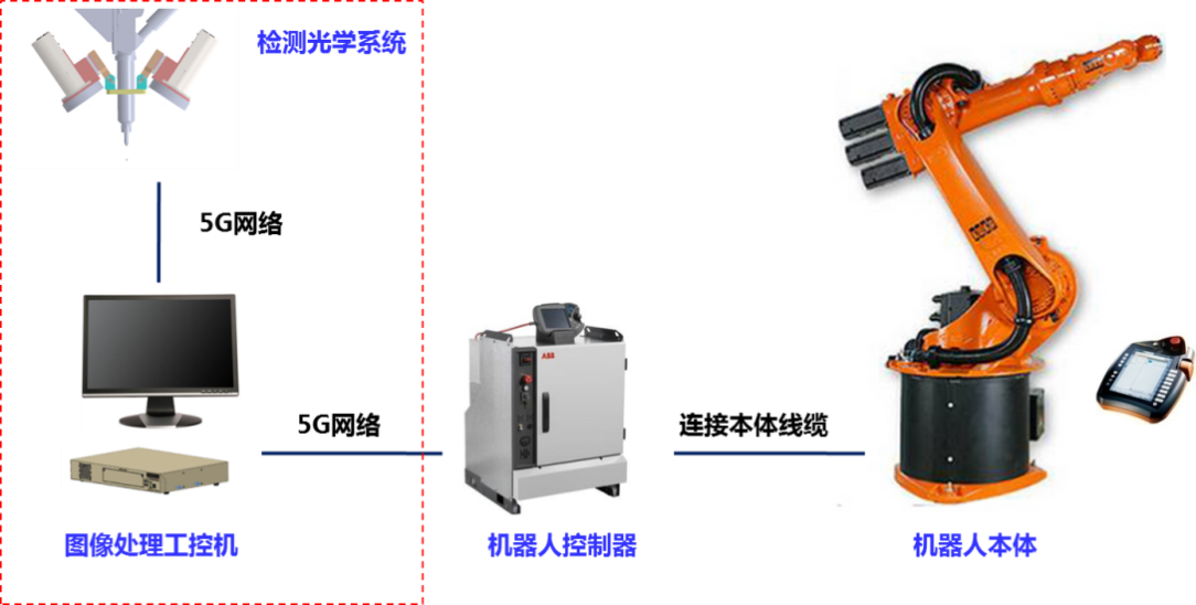 在涂膠機(jī)器人手臂加裝3D激光掃描設(shè)備,智能相機(jī)和補(bǔ)光設(shè)備,因機(jī)器手臂需進(jìn)行靈活作業(yè),所以數(shù)據(jù)通訊不能采用傳統(tǒng)的網(wǎng)線接入的方式,同時因3D掃描數(shù)據(jù)是動態(tài)數(shù)據(jù)傳輸,需實(shí)時傳輸且數(shù)據(jù)量較大,需借助5G網(wǎng)絡(luò)實(shí)現(xiàn)大數(shù)據(jù)同步傳輸,便于圖像處理系統(tǒng)能依據(jù)數(shù)據(jù)實(shí)時成像,其架設(shè)示例如下:紅框標(biāo)注部分為3D激光掃描設(shè)備和智能相機(jī)。