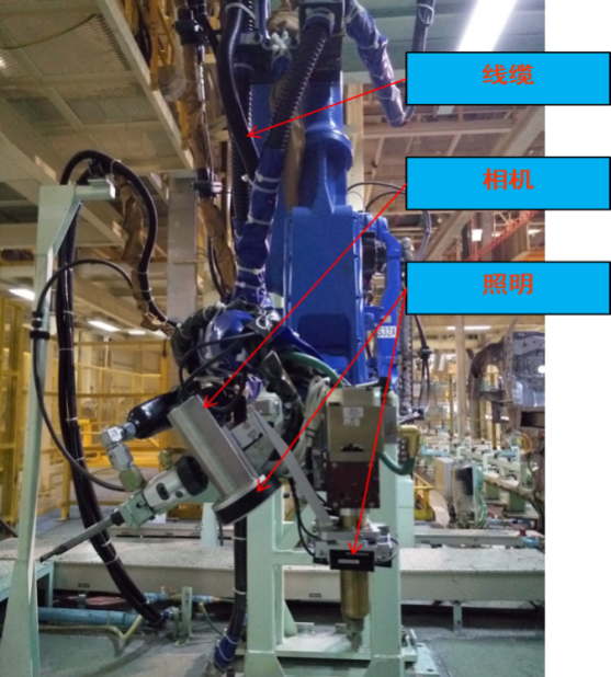 在涂膠機(jī)器人手臂加裝雙攝像頭,并配置補(bǔ)光設(shè)備,于膠槍兩側(cè)跟隨膠槍移動拍攝,將海量圖片通過5G網(wǎng)絡(luò)傳遞給圖像處理系統(tǒng),下圖是設(shè)備安裝的示意圖: