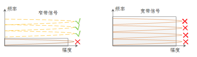 窄帶信號的使用不僅可以降低對網絡中其他系統(tǒng)的影響,同時降低了在頻域上被干擾的概率,如下圖所示: