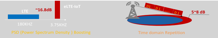 eLTE-IoT通過窄帶頻域占用以適配法規(guī)要求,通過提升功率譜密度來提升覆蓋,同時將待發(fā)送的數(shù)據(jù)調制后在多個時域內進行重復發(fā)送,在接收機側會將重復的信號進行累積從而獲得更高的信噪比,從而提升靈敏度和覆蓋范圍。最遠可實現(xiàn)10Km的覆蓋能力。