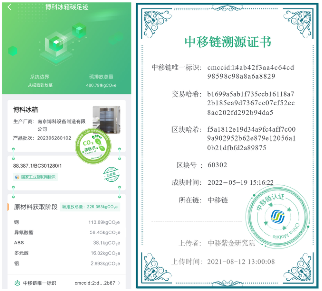 同時,本文聯合SGS通標標準技術服務有限公司、方圓標志認證集團等生態合作伙伴,提供產品碳標簽認證、溯源服務。碳標簽把產品在全生命周期內的溫室氣體排放用可量化的指標以及可視化的形式展示出來,公眾通過掃描碳標簽二維碼,可看到該產品從原料開采到運輸、產品生產到廢棄的全生命周期中所產生的碳排放以及上鏈存證等信息(見圖5)。碳標簽不僅有利于強化企業控制溫室氣體排放的主體責任,提升品牌價值,同時也能夠從產品側增強公眾積極應對氣候變化的意識,營造綠色低碳發展的良好氛圍。