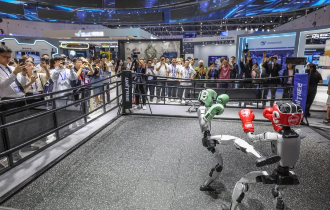 在第四屆全球數字貿易博覽會數智未來主題展區的杭州六小龍專區,宇樹科技的人形機器人在進行格斗擂臺賽。新華社記者 徐昱攝