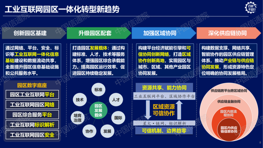 工業(yè)互聯(lián)網(wǎng)園區(qū)是以高質量發(fā)展為目標,按照工業(yè)互聯(lián)網(wǎng)內(nèi)涵要求,規(guī)劃、建設、運營、提升的新型園區(qū)。園區(qū)應緊密圍繞我國建設現(xiàn)代化經(jīng)濟體系這一戰(zhàn)略目標,以協(xié)同創(chuàng)新、集群集約、虛實融合、綠色低碳、安全生產(chǎn)為導向,通過網(wǎng)絡、標識、平臺、安全體系和新模式、新業(yè)態(tài)的構建,來指導新園區(qū)建設和存量園區(qū)轉型發(fā)展。