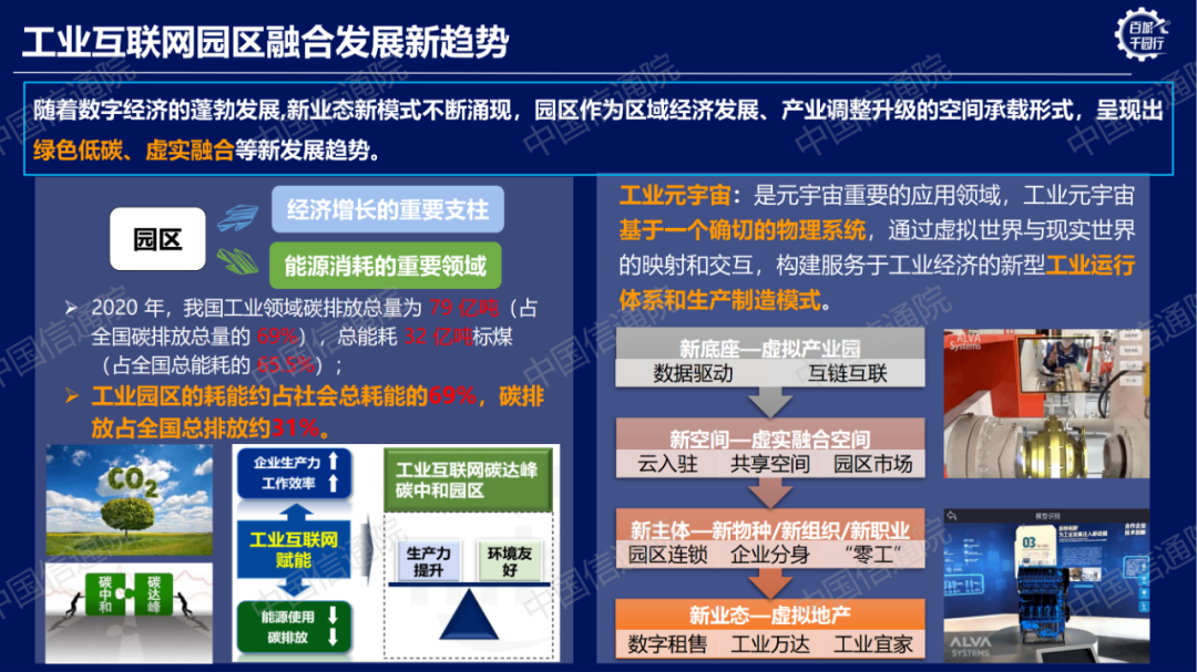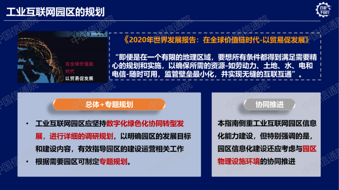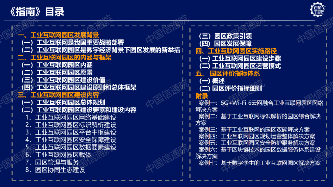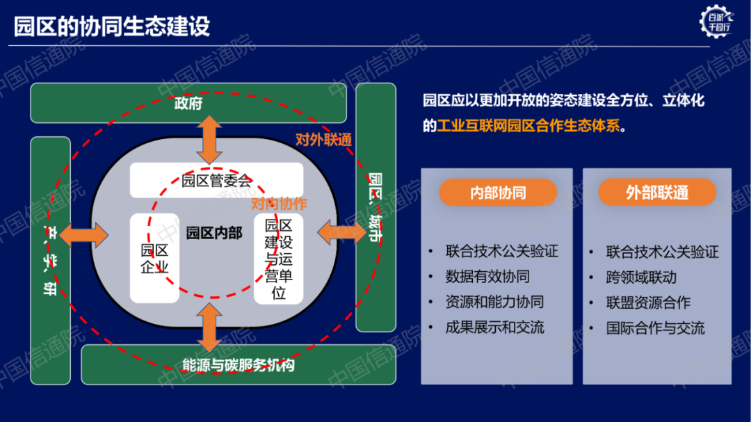 中國信通院總工程師敖立對指南(2.0版本)進行了詳細解讀。他指出指南(2.0版本)整體包括發(fā)展背景、內(nèi)涵框架、建設內(nèi)容、實施路徑和評價指標五個部分。圍繞數(shù)字經(jīng)濟、綠色低碳、中小企業(yè)特色產(chǎn)業(yè)集群等最新相關政策,更新了工業(yè)互聯(lián)網(wǎng)園區(qū)的最新發(fā)展背景、內(nèi)涵與框架,細化了標識、數(shù)據(jù)等園區(qū)建設內(nèi)容,增加了線上線下一體化的園區(qū)新運營模式總結,并相應的對評價指標體系進行了優(yōu)化調整。同時,結合工業(yè)互聯(lián)網(wǎng)園區(qū)近幾年的發(fā)展態(tài)勢,節(jié)選部分優(yōu)秀案例,以饗讀者。