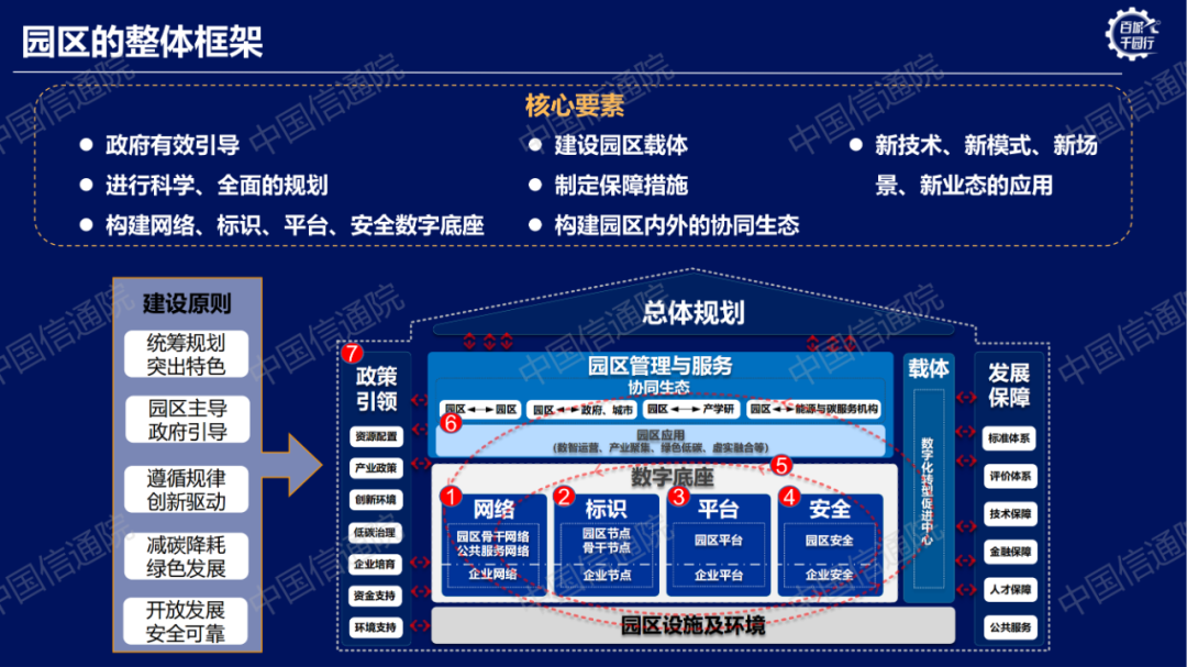 工業(yè)互聯(lián)網(wǎng)園區(qū)整體框架:工業(yè)互聯(lián)網(wǎng)園區(qū)的建設與發(fā)展,應在國家和各級地方政府政策措施的引領下,以科學規(guī)劃為指導,通過打造網(wǎng)絡、標識、平臺、安全等園區(qū)數(shù)字底座,構建園區(qū)內(nèi)部與外部的數(shù)據(jù)流動閉環(huán),形成各產(chǎn)業(yè)角色之間的協(xié)同有機生態(tài)。建設數(shù)字化轉型促進中心等載體,以標準、評價、金融等體系為保障,通過新技術、新模式、新場景、新業(yè)態(tài)的應用,形成園區(qū)的健康、低碳、良性、區(qū)域一體化發(fā)展的新發(fā)展模式,建立園區(qū)發(fā)展特色和發(fā)展優(yōu)勢。
