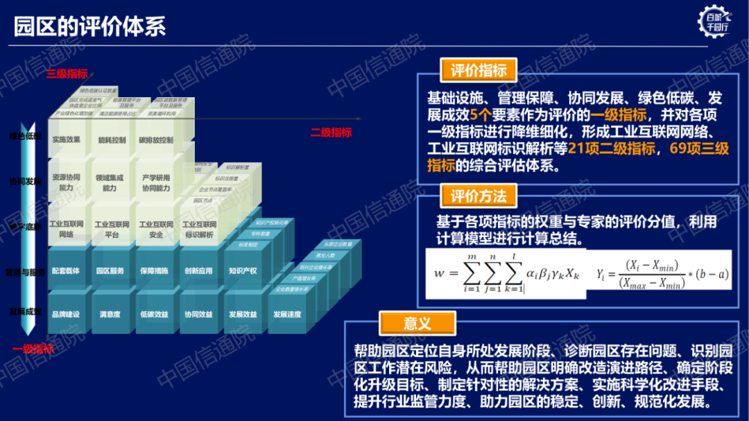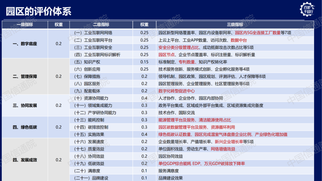 工業(yè)互聯(lián)網(wǎng)園區(qū)評價指標體系通過科學的方法,分別從數(shù)字底座、管理與服務、協(xié)同發(fā)展、綠色低碳、發(fā)展成效5個要素作為評價的一級指標,并對各項一級指標進行細化,形成工業(yè)互聯(lián)網(wǎng)網(wǎng)絡、工業(yè)互聯(lián)網(wǎng)標識解析等21項二級指標,69項三級指標的綜合評估體系。